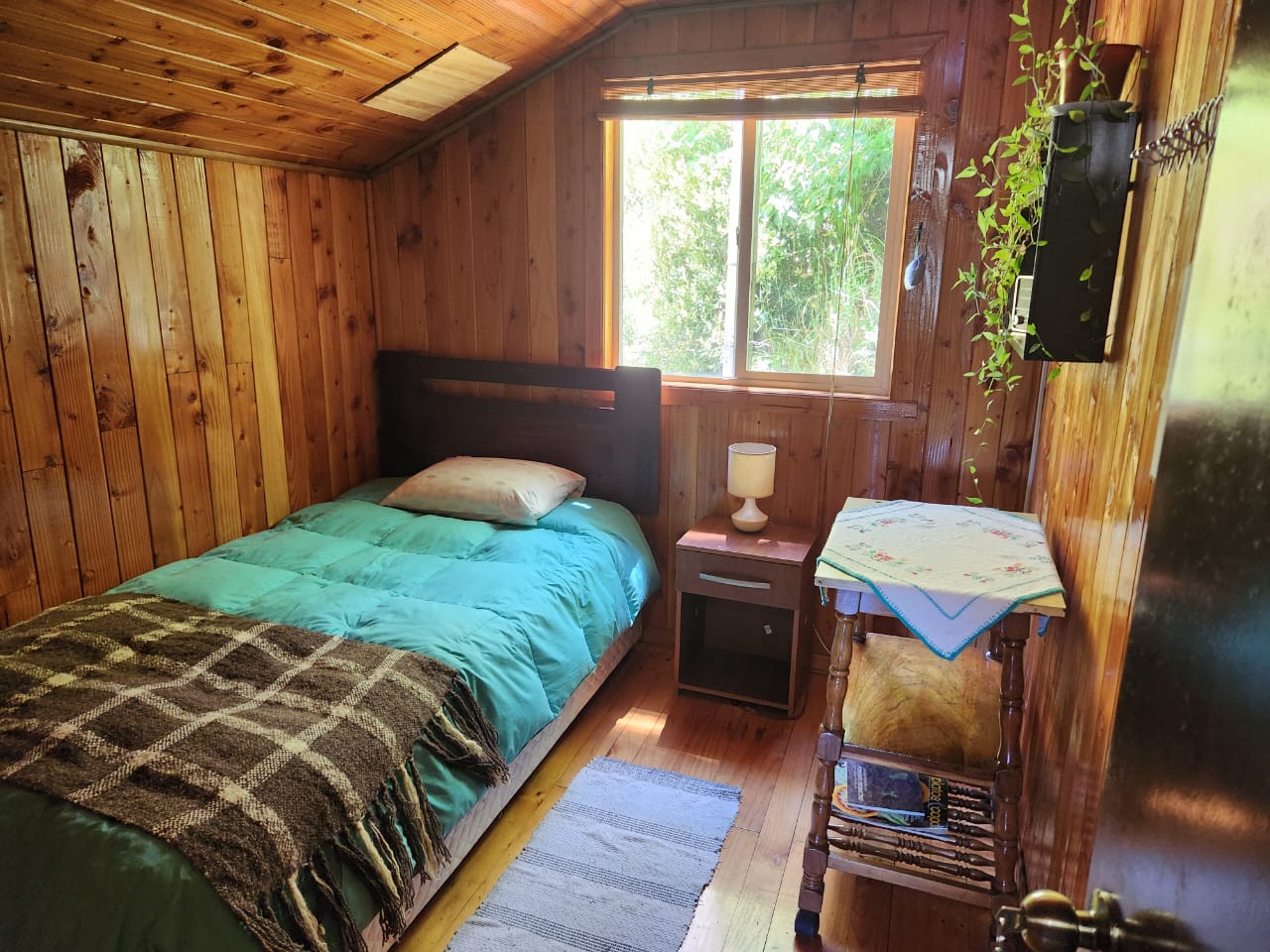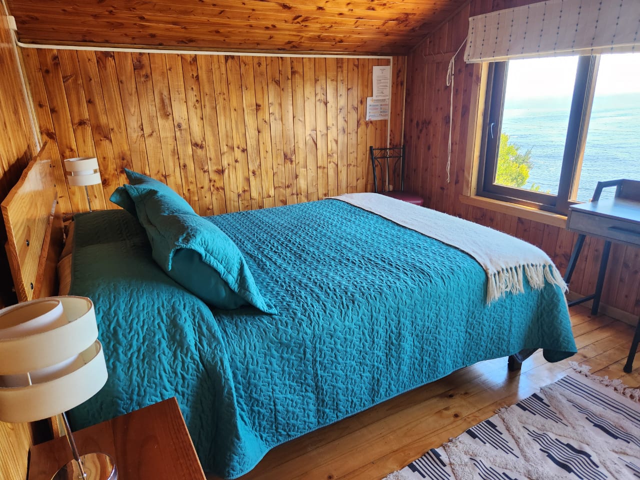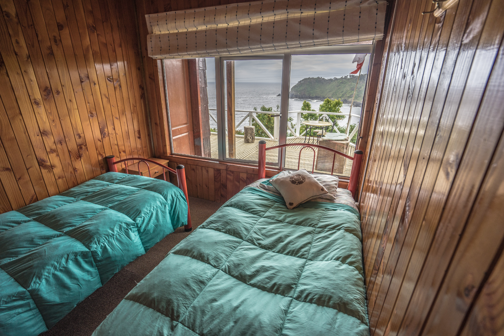 ALERCE: Habitación matrimonial y cama de plaza, ubicada en la planta baja de la Hostería, con vista parcial al mar y baño compartido.