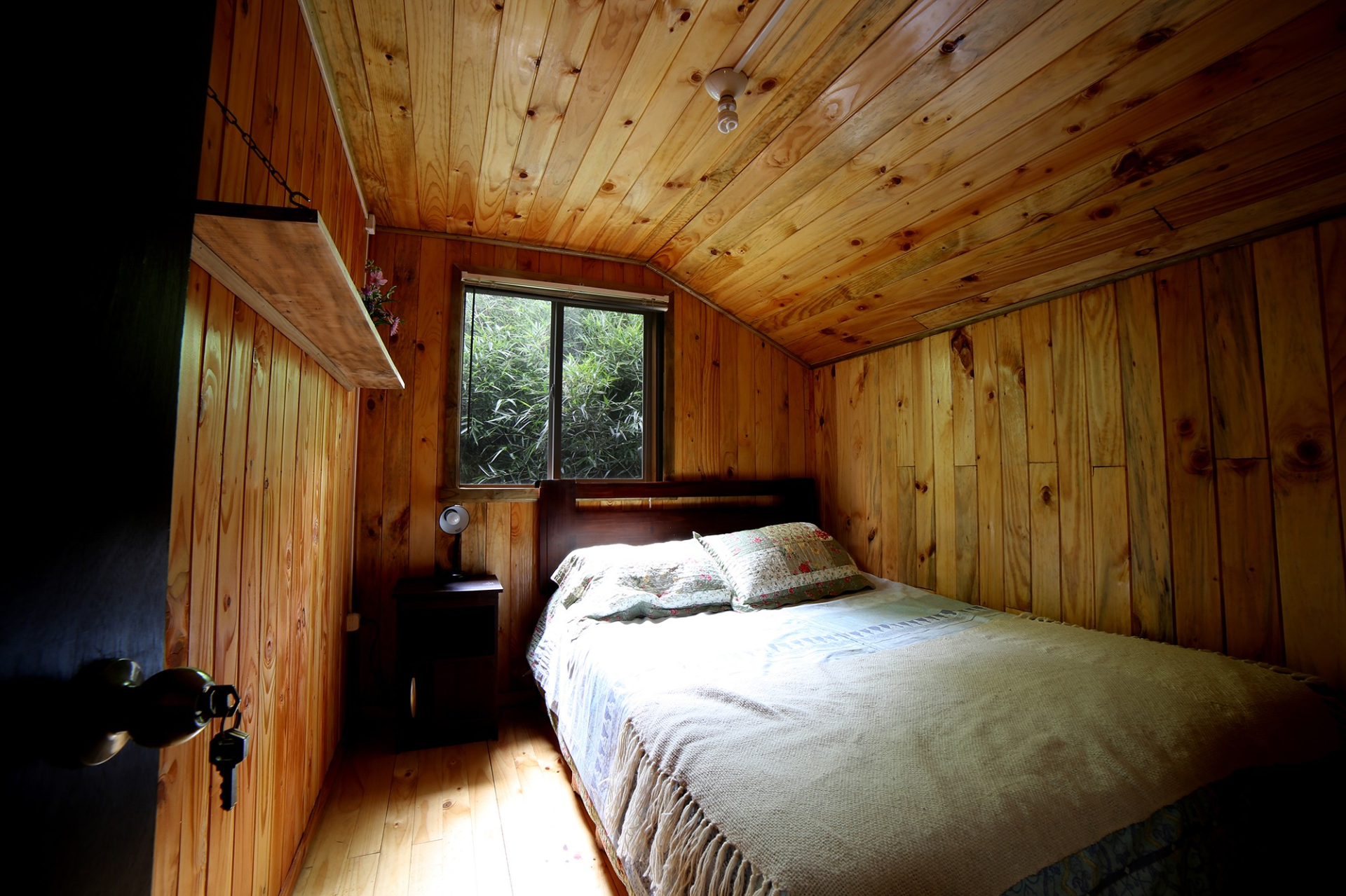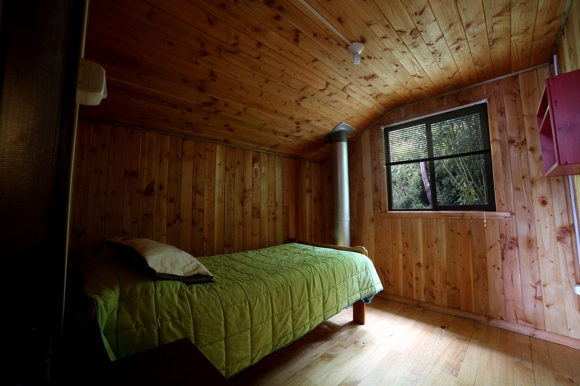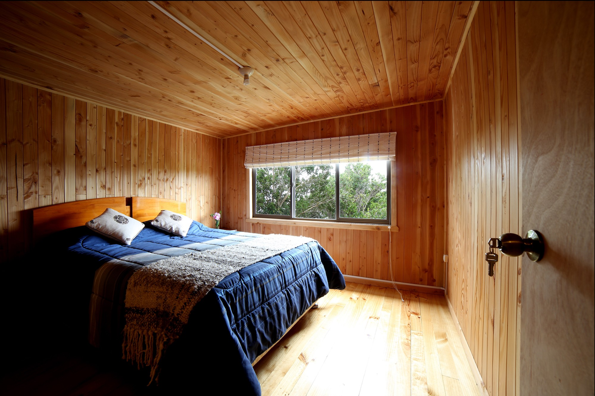ALERCE: Habitación matrimonial y cama de plaza, ubicada en la planta baja de la Hostería, con vista parcial al mar y baño compartido.